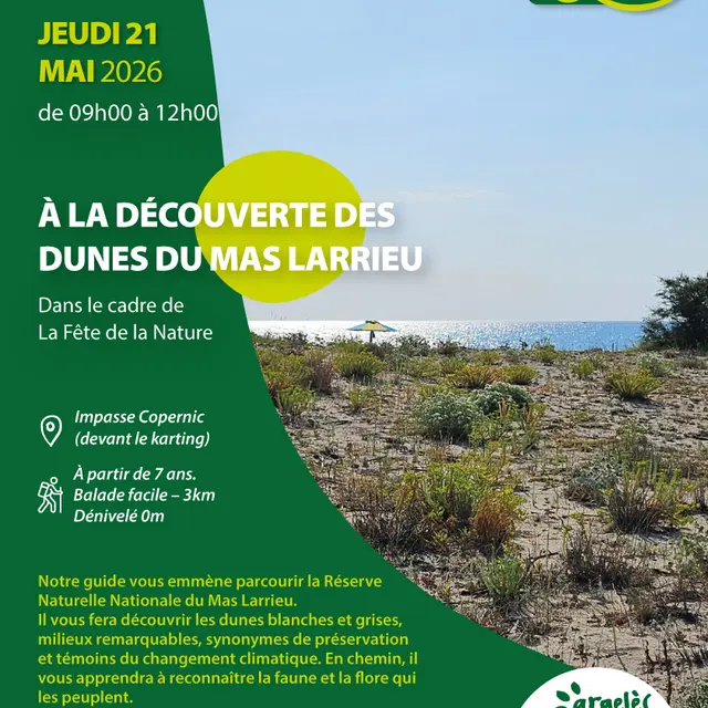 NOTRE GUIDE VOUS EMMENE PARCOURIR LA RESERVE NATURELLE NATIONALE DU MAS LARRIEU. IL VOUS FERA DECOUVRIR LES DUNES BLANCHES ET GRISES, MILIEUX REMARQUABLES, SYNONYMES DE PRESERVATION ET TEMOINS DU CHANGEMENT CLIMATIQUE. EN CHEMIN, IL VOUS APPRENDRA A RECONNAITRE LA FAUNE ET LA FLORE QUI LES PEUPLENT